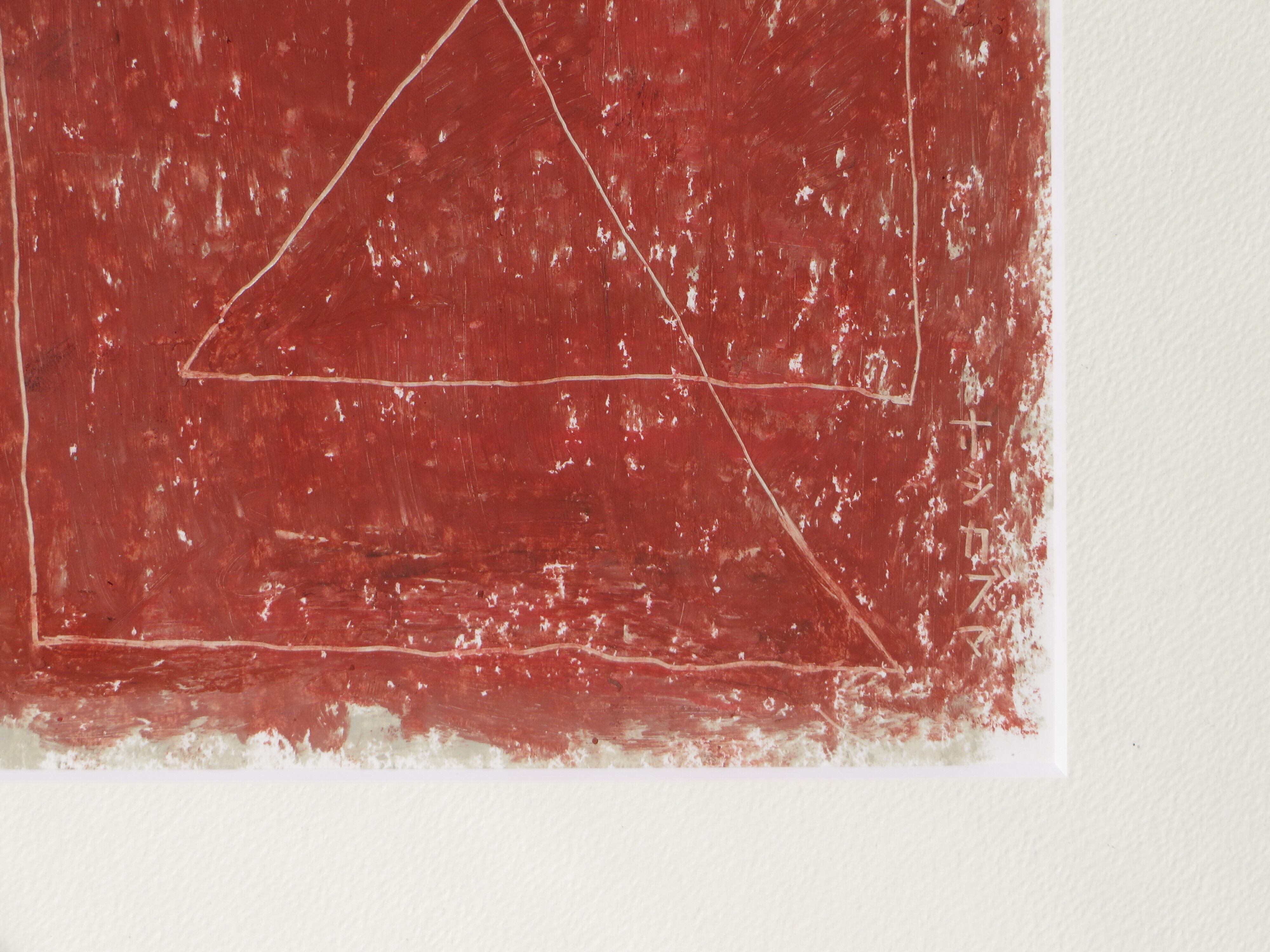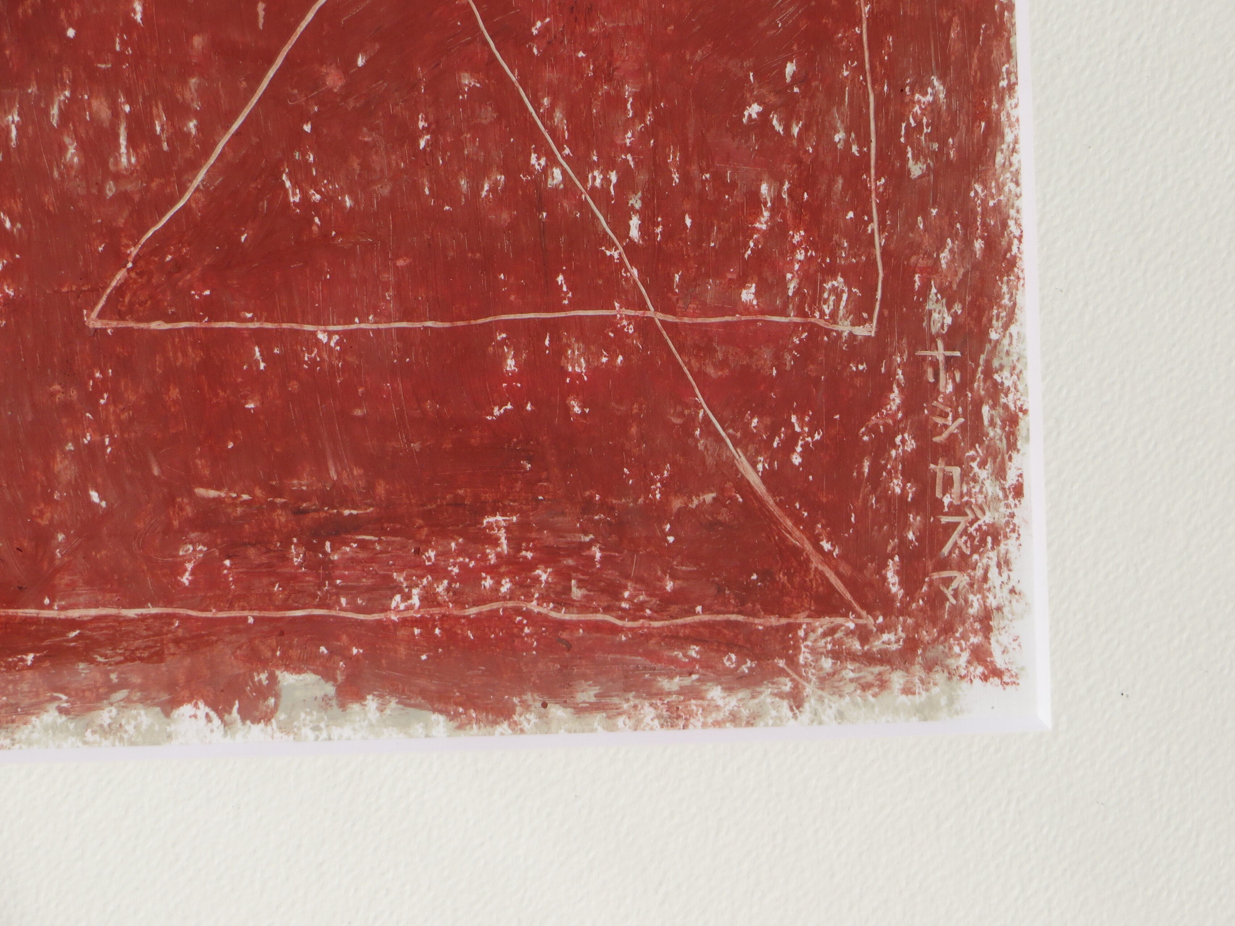 身近な画材であるクレパスを何層も塗り重ねたり削ったりを繰り返しながら、独特な絵肌を作り上げている。